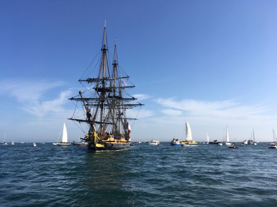 Como en todos los lugares a los que llega, el Hermione fue recibido con una fanfarria en el agua, por decenas de barcos que vinieron a celebrar su llegada, antes de ser guiado por el barco piloto hasta el Quai de la République, ¡con música! Una escala de 3 días, jalonada de visitas, eventos gratuitos organizados en los muelles (talleres de cordelería y marinería a cargo de los antiguos pescadores de Port-Vendres, el podio de la Marina Nacional, el Accrovoile [¡para subir a los obenques como los aparejos de la Hermione!], la feria de antigüedades [siglo XVII y tendencias marineras], exposiciones, una fiesta del libro y de la rosa, el mercado de productores [los días 21 y 22 de abril]...).