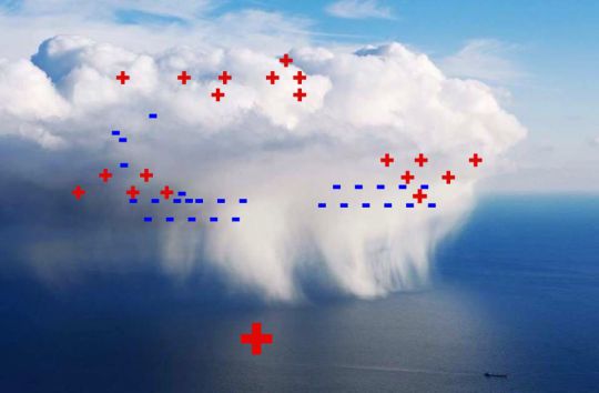 Los más finos, los cristales de hielo (positivos), suben a la parte superior de la nube, mientras que los más pesados, las gotas de lluvia (negativas), bajan. En la masa de nubes oscuras se forman zonas de cargas opuestas. Hay un desequilibrio eléctrico dentro de la nube, pero también fuera, entre la base negativa de la nube y la tierra positiva.
