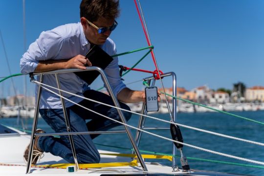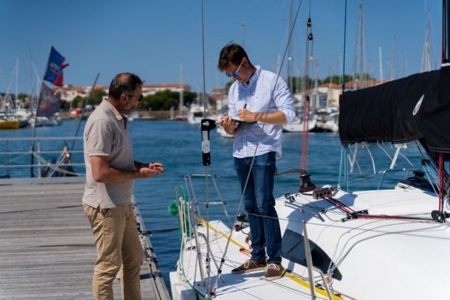 En busca de las últimas innovaciones, el astillero quiso probar un dinamómetro en el estay (un modelo que sustituye al tensor) y que permite una lectura inmediata a través de Bluetooth en un teléfono móvil. Esto significa que puede conocer la tensión del estay y ajustarla rápidamente si es necesario. La lectura de la tensión del estay da una buena indicación de la tensión general de este tipo de aparejo con empuje.