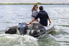 El habitáculo también está equipado con asientos tipo cubo y una banqueta trasera revestida de elegante skai rojo. Los accesorios de acero inoxidable completan el barco.