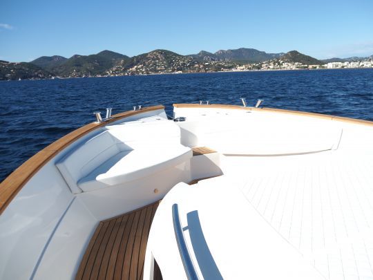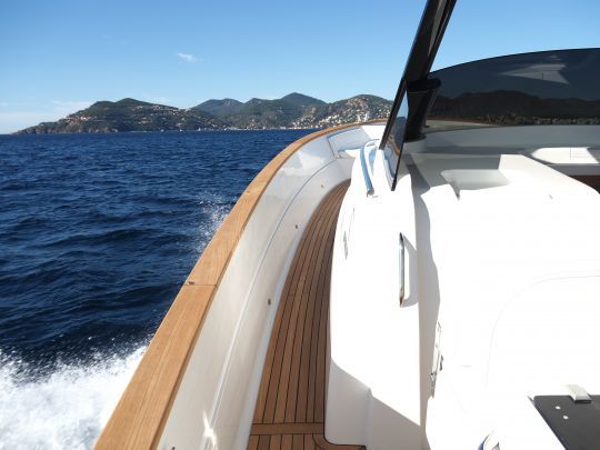 Tras pasar el fondeadero frente a la playa, pusimos rumbo al macizo del Esterel. Los 1.200 caballos de potencia le confieren una aceleración evolutiva que no apurará a la tripulación.