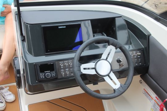 Sin embargo, una vez sentado, el acelerador es fácilmente accesible para la mano derecha del piloto y el volante está bien dispuesto. Delante, el salpicadero está bien distribuido, con espacio para un bonito plotter y una radio. También hay un bolsillo en el lado derecho para guardar y recargar teléfonos. El parabrisas es lo suficientemente alto como para que la gorra del conductor no salga volando a toda velocidad