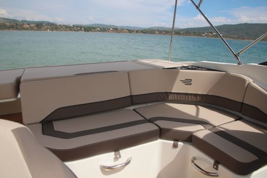Este bowrider tiene un precioso asiento corrido en forma de U que proporciona dos lugares estupendos para sentarse con el pelo al viento mientras se navega. Los asientos son lo suficientemente grandes para que una persona de 1,80 m de estatura pueda sentarse con las piernas estiradas y la espalda apoyada en la consola. Es un lugar cómodo para sentarse, con buena visibilidad durante la navegación. Este rincón de proa puede transformarse en una completa zona para tomar el sol con la adición de un cojín, o en una zona de comedor/apéro con la adición de una pequeña mesa redonda.