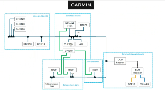 La nueva configuración se basa en una completa red NMEA 2000. En la mesa de cartas, un GPSMAP 1223 (plóter multifunción de 12 pulgadas) centraliza los datos de navegación. Se comunica con un anemómetro de veleta GND10 y un sensor DST810 (profundidad, velocidad, temperatura).