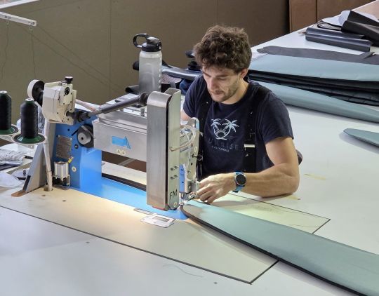 Voilerie Marine Pro se fundó hace menos de dos meses en el corazón de Le Pouliguen, a dos pasos de la estación SNCF. Detrás del nombre hay un profesional experimentado: Romain Bellet, de 32 años, antiguo deportista de alto nivel con una sólida experiencia en vela ligera y catamaranes deportivos. Formado en La Rochelle, entonces miembro del Pôle France, ganó un campeonato del mundo juvenil en SL16 en 2008. Hoy, esta cultura orientada al rendimiento se refleja en su enfoque artesanal de la fabricación de velas.