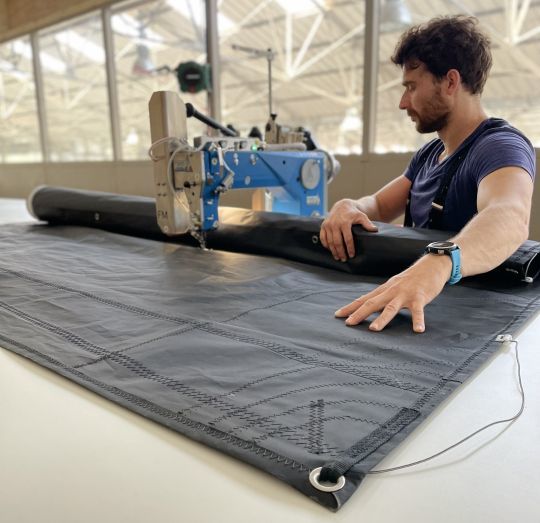Mientras que las velas se fabrican localmente, el corte se subcontrata. Romain Bellet diseña los modelos por ordenador antes de cortarlos con láser en La Rochelle. Este método garantiza una mayor precisión y adaptabilidad a la demanda. Una vez recibidos los paneles, se ensamblan a mano en el taller de Le Pouliguen, según las especificaciones del cliente.
