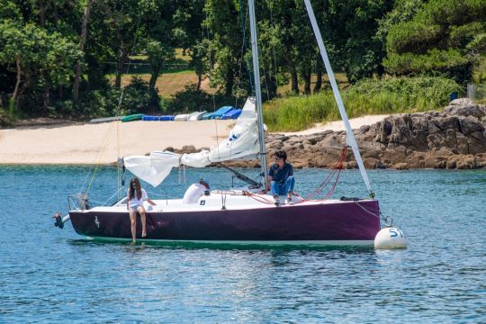 Bajo la caseta, el volumen interior es limitado pero suficiente para utilizarlo como refugio: dos asientos longitudinales corridos y una plataforma delantera pueden utilizarse como litera adicional o espacio de almacenamiento. Seguimos hablando de lo esencial para un velero de 7 metros, pero los asientos están ahí, con una altura de la caseta que protege a los pasajeros sentados de la lluvia o el sol.