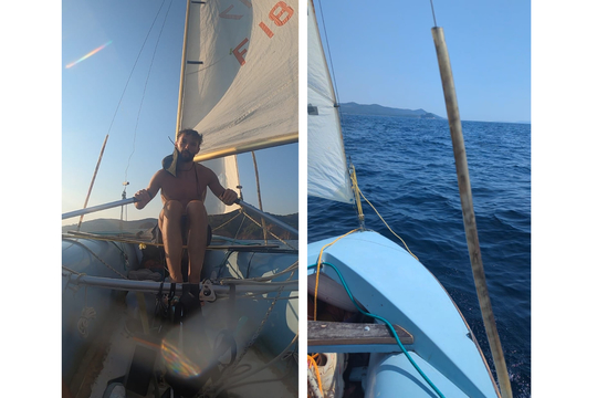 Aunque la primera semana transcurrió en condiciones muy ligeras, con poco o ningún viento, Romain pudo encontrar su propio ritmo. Reconoce que nunca había tenido que hacer rápel, poner los pies en las correas, ¡y mucho menos hacer el trapecio! Llevó a bordo a su primo durante 2 días e incluso hizo autostop con un turista en una playa... Por lo demás, navega solo en su 420.