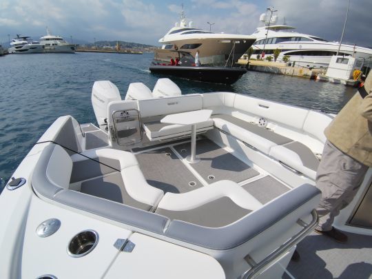 Detrás de sus elegantes líneas, el Wellcraft 38 T-Top esconde un programa muy claro. Tres motores Mercury V10 de 350 CV le permiten alcanzar velocidades de más de 50 nudos, transformando esta consola central en un impresionante crucero rápido. Pero la filosofía del modelo no se limita a la velocidad: el 38 T-Top también está orientado a la pesca deportiva, gracias a numerosos portacañas y compartimentos técnicos de almacenamiento, así como a las actividades de ocio en familia, con una amplia bañera modular, una cubierta lateral basculante y una confortable cabina. La presencia de un equipo de cocina exterior subraya esta voluntad de polivalencia: la embarcación puede utilizarse con la misma facilidad como base para una jornada deportiva que para un crucero rápido.