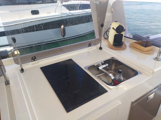 El espacio interior se ha rediseñado para ofrecer mayor habitabilidad que el prototipo. Dos camarotes dobles, un salón convertible, un baño completo y una cocina funcional proporcionan un alojamiento confortable para hasta siete personas.