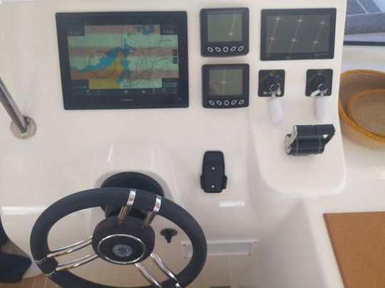 La unidad de control central, las dos pantallas Garmin y la interfaz de control de la energía proporcionan lecturas en tiempo real de los flujos de producción y consumo. Una segunda pantalla muestra los datos solares y de autonomía. Una mesa de mapas completa la instalación, con una fuente de alimentación de 220 V y conectividad 4G mediante un terminal Wi-Fi.