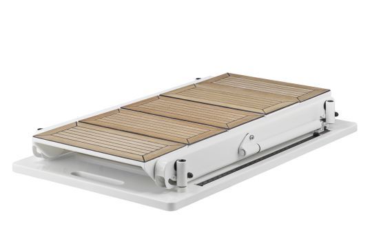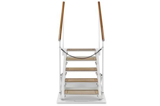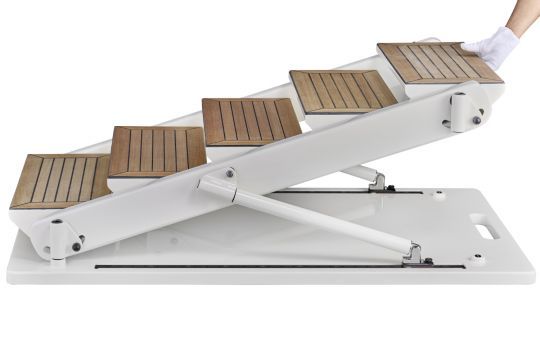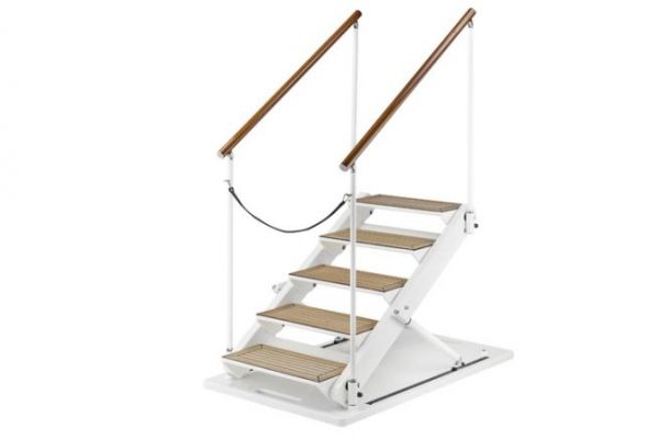 Le Varios pasos está diseñado para soportar una carga útil de 250 kg. Puede equiparse con superficies antideslizantes o peldaños de teca, según prefiera el propietario. Los pasamanos de carbono o teca completan el conjunto. Multiplex también ofrece la posibilidad de adaptar el color de la estructura para que combine con las líneas del yate. El accesorio se guarda en una bolsa de transporte específica, diseñada para ocupar el menor espacio posible a bordo.
