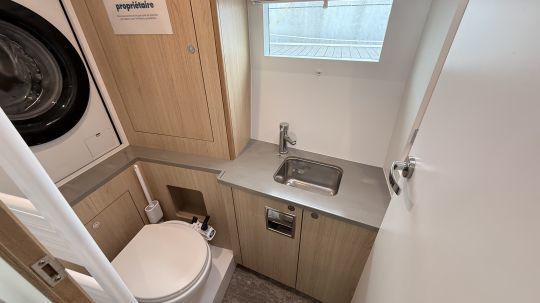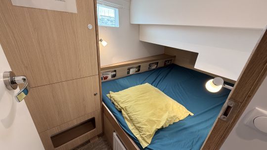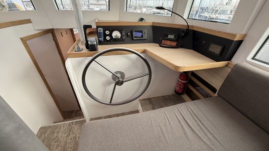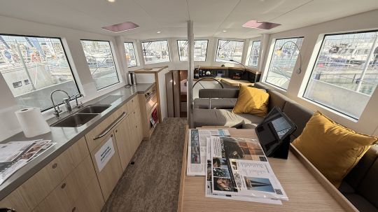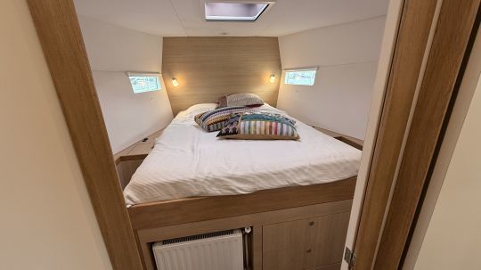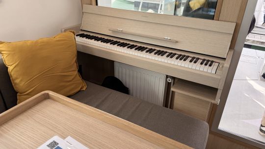 La zona de estar es luminosa y flexible, con una cocina totalmente equipada (tres fuegos de gas, frigorífico con cajones, fregadero doble, microondas inverter, lavadora de 3 kg). La mesa plegable ofrece espacio adicional para dormir. La zona de descanso se compone de dos camarotes dobles, uno de ellos en proa con mucho espacio de almacenamiento. Un cuarto de baño con ducha independiente completa la distribución. Un detalle divertido es el piano situado en la parte trasera de este salón tan acogedor.