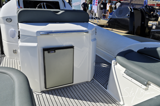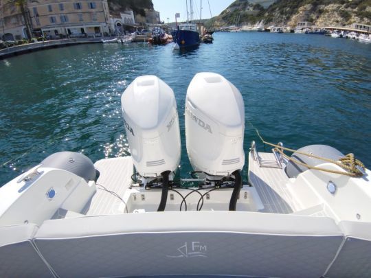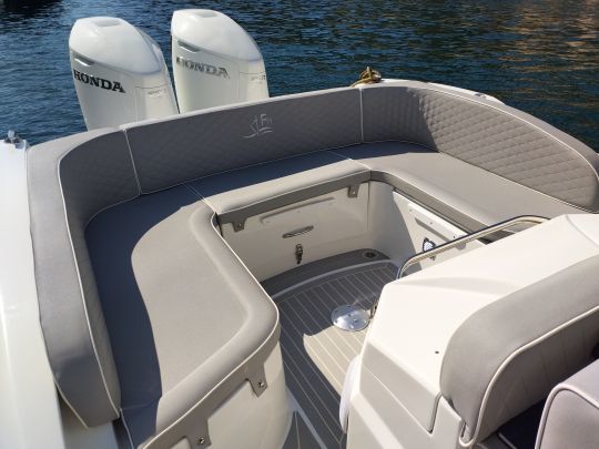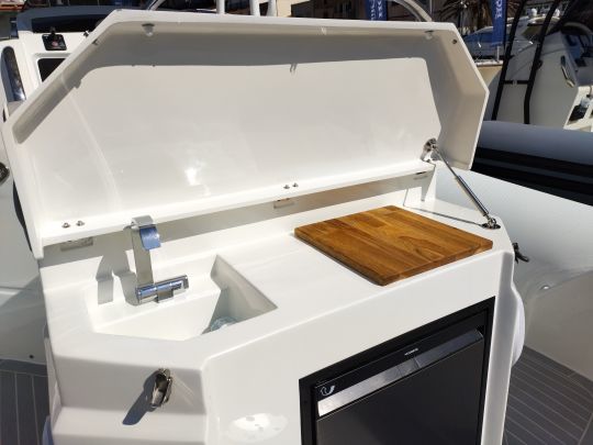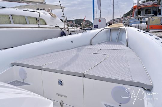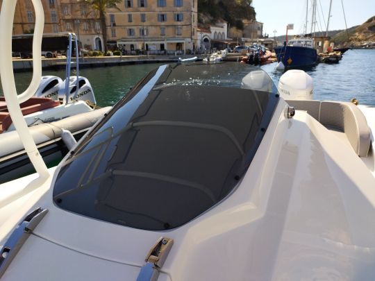 Esta disposición de la cubierta confirma la voluntad del astillero corso de ofrecer una semirrígida ante todo funcional, capaz de una sucesión de fondeos o travesías rápidas sin renunciar al confort a bordo.
