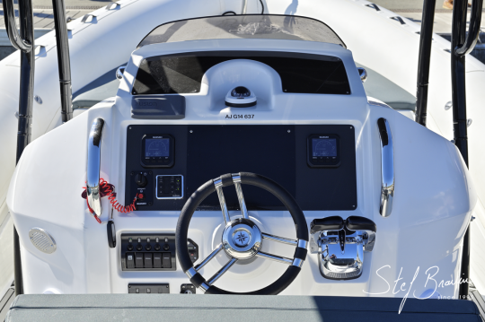 En el exterior, el salpicadero presenta dos pantallas âeuro de tamaño medio, instrumentación Honda para los datos del motor y un plotter GPS Simrad para la navegación âeuro, complementados por un equipo estéreo Fusion, tomas USB y una brújula centrada en la lÃnea de visión.