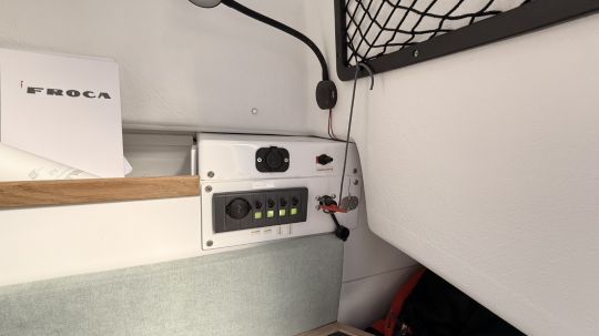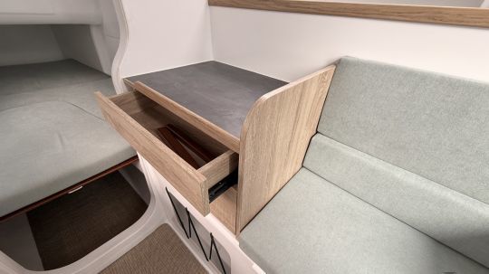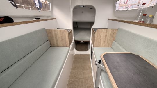 El volumen interior de la 26.5 representa un avance significativo en la gama. El camarote de proa, separado por una lona, dispone de una litera doble de 1,40 m en la cabecera, estrechada a 1 m en los pies. El salón, con una altura libre de 1,80 m, incluye dos bancos laterales convertibles en literas de unos 60 cm de ancho (las literas pueden extenderse al pasillo durante la noche). El equipamiento interior sigue siendo básico: un fregadero, un pequeño hornillo, agua dulce y una zona de aseo bajo la litera delantera. Esta configuración está claramente orientada a viajes de pocos días por aguas costeras, manteniendo un mínimo de comodidad para una familia de cuatro miembros.