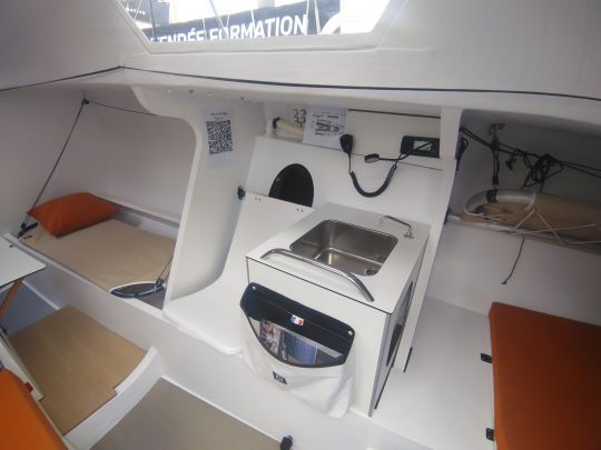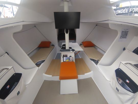 Todo el barco destila espíritu de regata y precisión. La disposición de la cubierta, elaborada en colaboración con los regatistas, favorece la circulación fluida y el trimado rápido. Los tanques de lastre laterales y de popa atestiguan la voluntad del barco de rendir tan bien con tripulación completa como a dos.