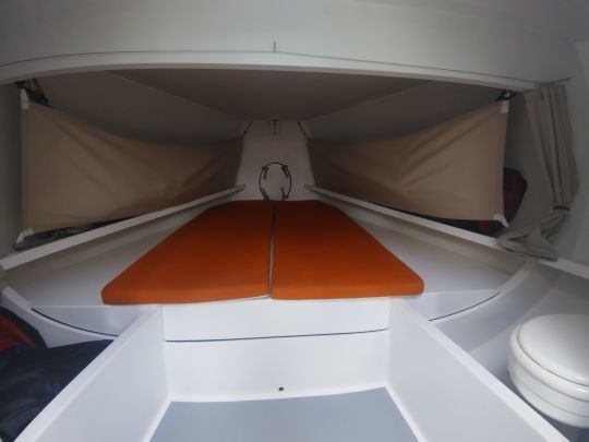 En la proa, un pequeño espacio alberga un inodoro marino y un lavabo; en la popa, dos literas individuales para la guardia. La altura libre es de unos 1,90 metros en la escalera.