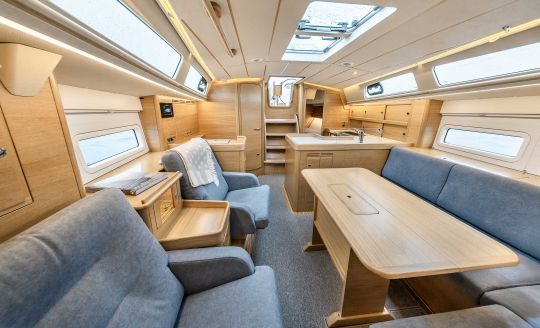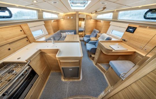Bajo cubierta, la distribución del Hallberg-Rassyâeuros¯370 refleja las señas de identidad del astilleroâeuros¯: carpintería meticulosa, luz y circulación fluida. Se puede elegir entre acabado en caoba Khaya o roble europeo claro. El salón dispone de asientos corridos de 2,04âeuros¯m y la posibilidad de sustituir el asiento corrido de estribor por dos sillones, una característica inusual para este tamaño.