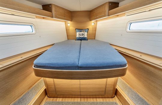 El camarote de proa puede equiparse con una cama central o lateral, según el programa. La cocina, situada a babor, tiene una gran capacidad de refrigeración y una profunda superficie de trabajo, con la opción de un lavavajillas o un congelador adicional. En conjunto, el espacio vital está optimizado para cruceros de corta duración.