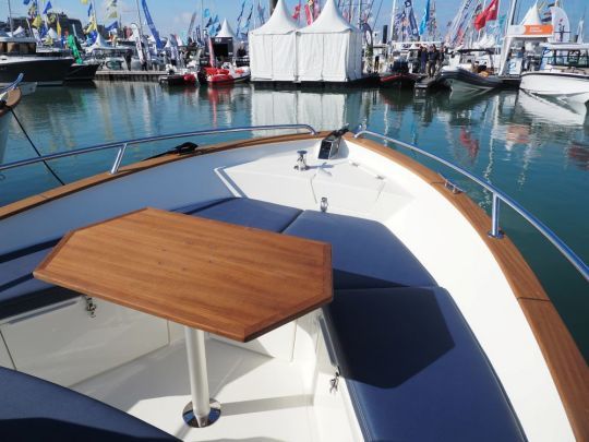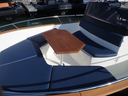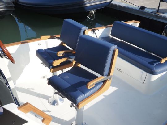 Estéticamente, el 23 Origine retoma los códigos visuales de la marca: casco azul oscuro, borda de madera (iroko) y tapicería sencilla de tejido hidrófugo. El conjunto es coherente, sin resultar recargado. Hay un salón de cubierta a proa con una mesa extraíble, una zona central con dos asientos de timón regulables y un banco triple a popa.