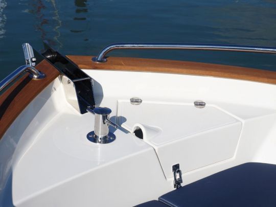 Todo se ha diseñado para maximizar el movimiento a bordo, con amplias cubiertas laterales, pasamanos bien situados y fácil acceso a la proa. Hay un cofre en la proa, bajo la consola, con una toma de 12 V y mucho espacio para bolsas o equipos.