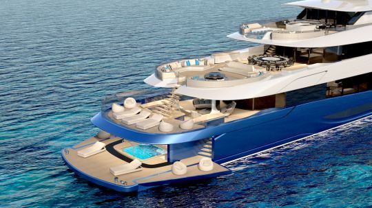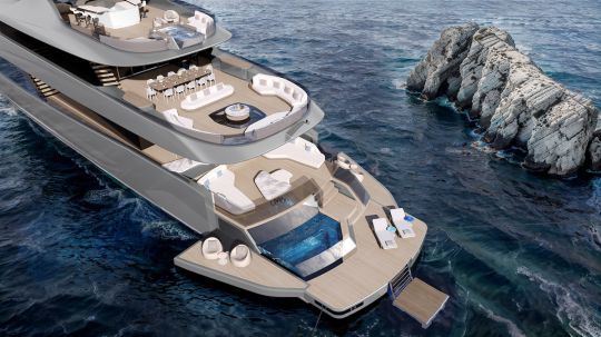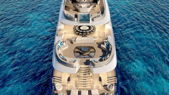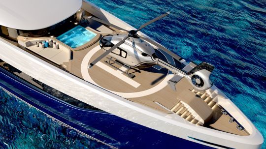 El LIVIA 72 tiene una eslora nominal de 1.700 GT para 72 metros, una media muy generosa. Este volumen ofrece 12 camarotes para invitados, una suite para el propietario, una zona de bienestar, un club de playa con cubiertas abatibles, un garaje en proa y una heliplataforma. En resumen, todo lo que suele encontrarse en yates de 80 metros o más.