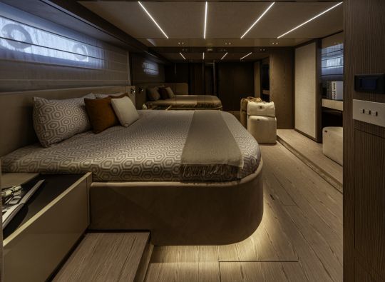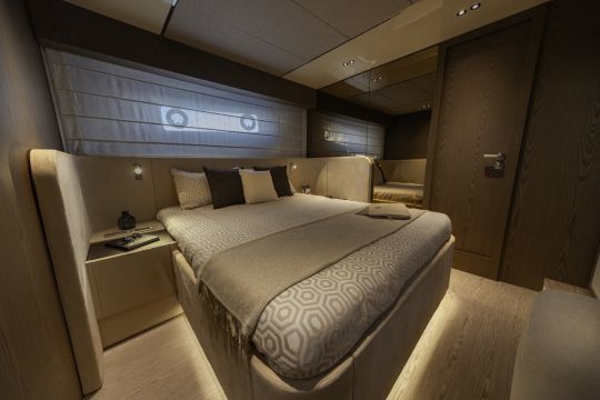 La distribución ofrece dos camarotes (armador y VIP), que pueden disponerse a proa o en medio del barco, cada uno con baño privado. Opcionalmente, se puede añadir un tercer camarote o una cocina central, así como un alojamiento para marineros.