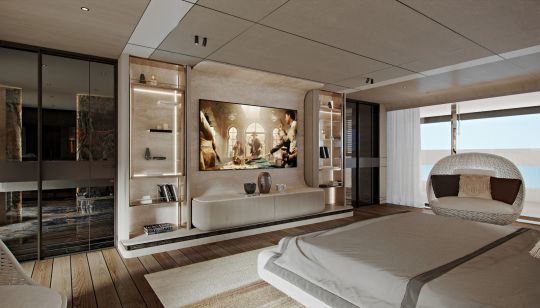 Además de las embarcaciones auxiliares y los juguetes acuáticos (hasta 12 embarcaciones en total), el Super Polaris 70 ofrece un club de playa de 180 metros cuadrados con spa, gimnasio y piscina. La cubierta principal cuenta con un jardín de invierno y el camarote del armador, un piso central con dos terrazas de 20 metros cuadrados. La cubierta superior está dedicada a los VIP, con su propia terraza. Este nivel de personalización, posible gracias a Pulina Exclusive Interiors, requiere un alto nivel de coordinación entre la arquitectura naval y el diseño de interiores.