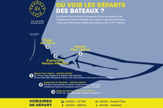 Para quienes no puedan estar en Le Havre, la carrera se retransmitirá en directo por televisión y en línea. Francia 3 y france.tv retransmitirá la salida entre las 10.00 y las 15.30 horas, acompañado de un grupo de expertos en directo. Un mapa interactivo permitirá seguir las posiciones cada cinco minutos hasta las 15.30 h, accesible en la web oficial de la carrera. Las primeras clasificaciones aparecerán a las 16.00 horas.