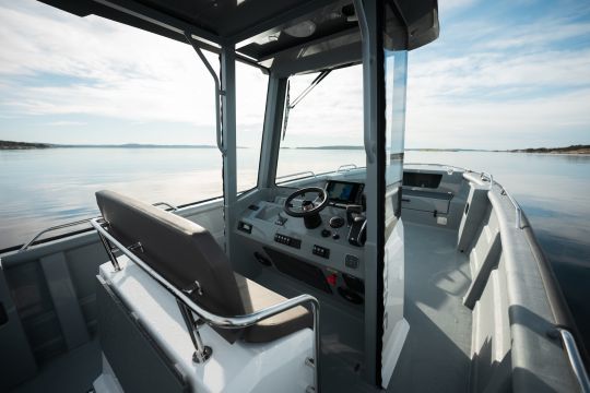 Esta elección ofrece protección contra las salpicaduras y el sol, al tiempo que mantiene una buena visibilidad de 360 grados, útil para vigilar trampas, cabos o redes. El alto francobordo de la embarcación y su estabilidad lateral en parado la hacen ideal para desplazarse con mar gruesa.