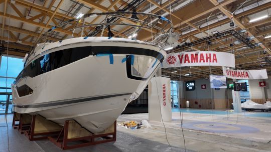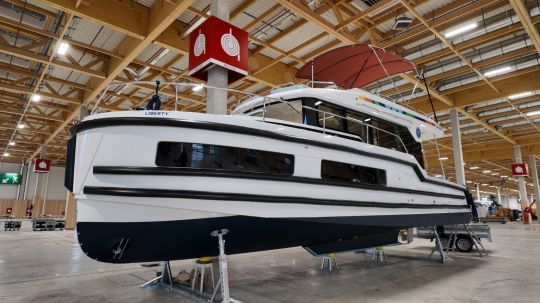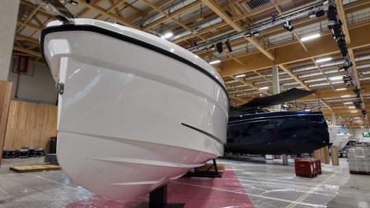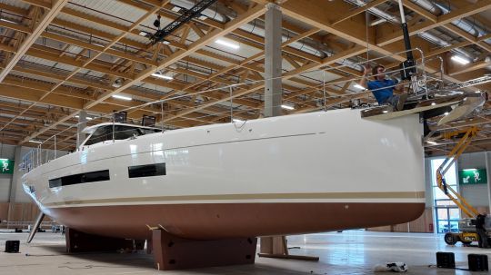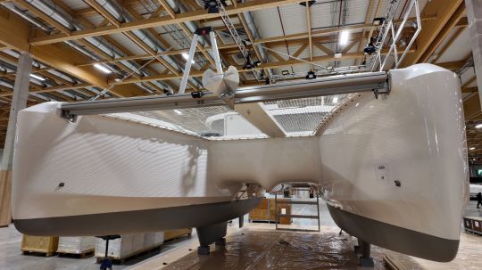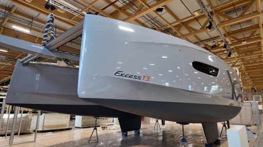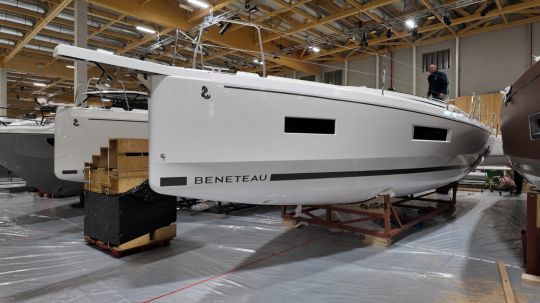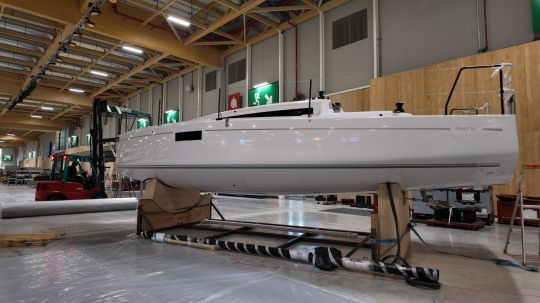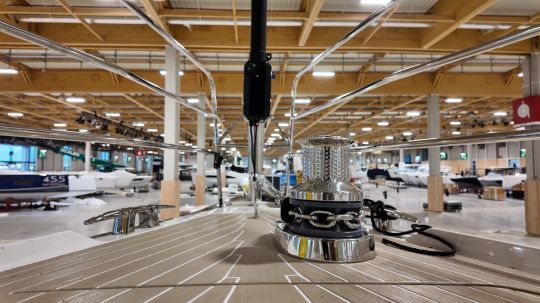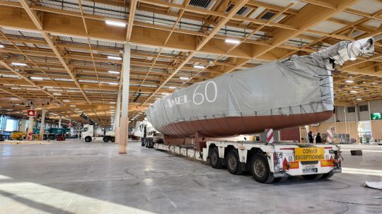 La mayoría de las veces, no se puede elevar mucho. La altura del techo limita el margen de maniobra: hay que levantar el casco, desplazar el remolque hacia atrás y, a continuación, colocar la embarcación en el suelo sobre su cuna. Algunos barcos, como el Amel 60, hay que "bajarlos" quitando el hard top. En cualquier caso, los yates llegan este año sin sus quillas.
