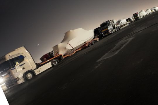 Una vez llegados al aparcamiento del Parc des Expositions du Bourget, los convoyes esperan. Los barcos no entran todos al mismo tiempo: se establece previamente un orden de paso en función de la disposición de los pabellones. Las grúas se colocan a pocos centímetros del remolque.