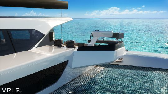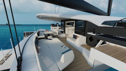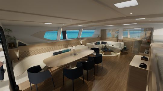 Este trimarán no es sólo números. A bordo, los 123 m² de espacio habitable son totalmente personalizables. La suite del propietario de 12 m² con acceso directo a la cubierta, la bañera de 25 m² y los 160 m² de camas elásticas lo convierten en un auténtico loft sobre el agua. Todo se ha diseñado para que la circulación sea fluida, los movimientos naturales y los puestos de maniobra accesibles.
