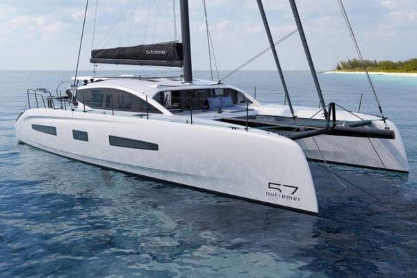 El Outremer 57, más compacto con sus 17,60 metros, sigue los pasos del popular 55. El diseño mantiene sus líneas limpias, su silueta baja y su estética reconocible al instante. Menos orientado a la náutica de recreo, se dirige a navegantes exigentes que buscan un catamarán elegante, fiable y fácil de manejar en el día a día.