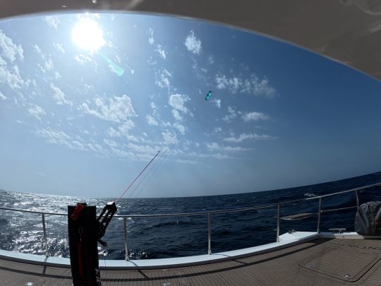 El catamarán también probó sistemas auxiliares de propulsión, incluida una vela cometa en fase de desarrollo, utilizada a título experimental. Aún no se dispone de cifras, pero las primeras impresiones son alentadoras para la navegación a favor del viento.