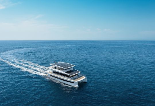 - Paneles solares de alta eficiencia que cubren los techos y el flybridge, produciendo hasta 60 kWh/día