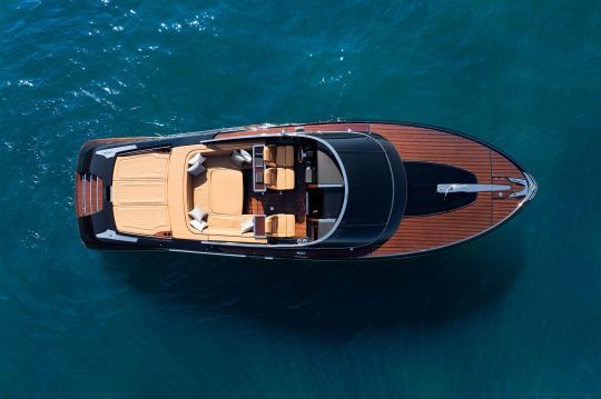 La firma estética se mantiene fiel a los códigos Riva. Tapicería de cuero acanalado inspirada en los años 50, chapas de caoba barnizada, perfil afilado y volúmenes refinados. Los colores interiores van del bizcocho al blanco roto, con una versión Aquamarine que recuerda algunos de los modelos emblemáticos del astillero.