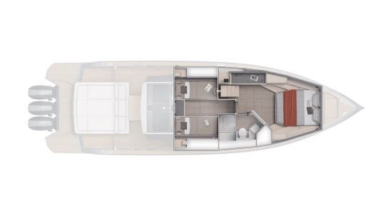A menudo se critica a los motores fueraborda por invadir el espacio habitable, especialmente en la popa. En este caso, el astillero ha evitado este escollo replanteando por completo la distribución de la cubierta. La bañera sigue teniendo mucho espacio para moverse, con bancos ergonómicos y una mesa modular que puede transformarse en una zona para tomar el sol.