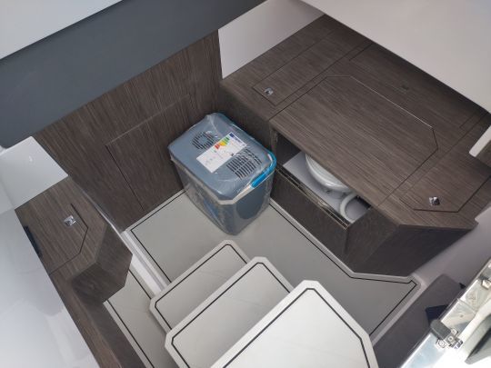 El camarote cuenta con un amplio espacio de almacenamiento y un aseo eléctrico independiente, con privacidad reforzada por los cristales tintados. Una distribución que abre la puerta a salidas de varios días, sin convertir el barco en un crucero permanente.