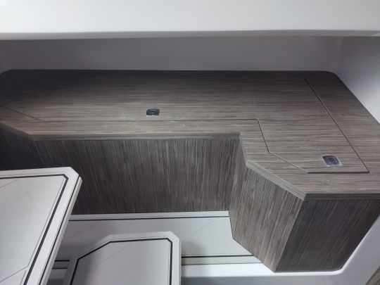 A proa, la cubierta cuenta con un salón convertible. Con una mesa extraíble, cojines ajustables y respaldos desmontables, puede pasar rápidamente de zona de comedor a zona para tomar el sol. Los armarios bajo los asientos ofrecen mucho espacio, unidos entre la proa y la popa.