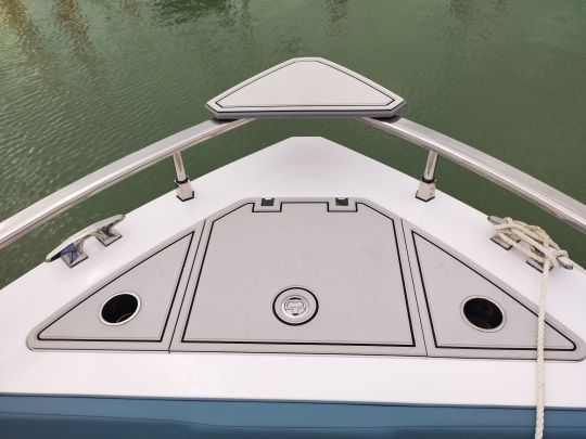En su versión equipada con el BF350 V8, la embarcación alcanza una velocidad de crucero de unos 25 nudos y una velocidad máxima medida en torno a los 44 nudos. A 25 nudos, el consumo de combustible ronda los 40 litros por hora, una cifra razonable teniendo en cuenta el tamaño, el peso y la potencia de la embarcación.