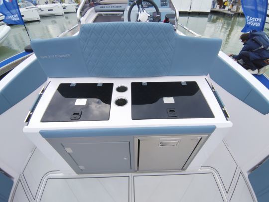 La cocina exterior es deliberadamente sencilla. Fregadero, almacenamiento y espacio para un hornillo o una plancha cubren todo lo esencial sin sobrecargar el espacio. Hay mucho espacio de almacenamiento bien distribuido, con un maletero trasero grande, accesible y organizado, capaz de albergar el equipo de a bordo, defensas y accesorios.