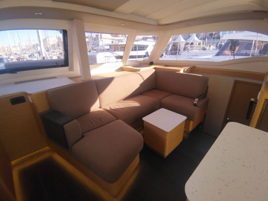El modelo también se ofrece con la solución híbrida desarrollada internamente por Fountaine Pajot, que combina baterías de litio, vainas eléctricas y un generador de seguridad. Este enfoque pretende limitar el uso de combustibles fósiles manteniendo un margen de seguridad en crucero.