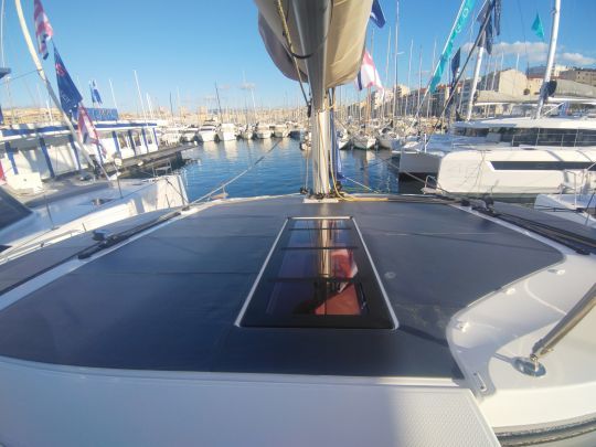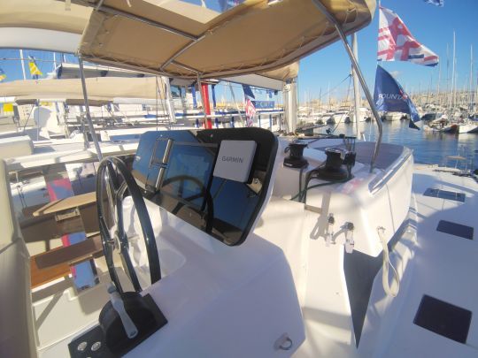 El puesto de gobierno semiintegrado se mantiene fiel al ADN del astillero. Bien protegido, ofrece una buena visibilidad de las velas, el agua y la tripulación. Todas las maniobras están al alcance de la mano: mayor, escotas, rizos, gennaker y trimado regular.