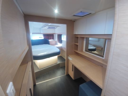 El FP41 está disponible en versión propietario, con un casco de babor convertido en suite, o en versión de cuatro camarotes. Las camas dispuestas en diagonal son una de las señas de identidad de la gama, ya que ofrecen una mejor circulación y una mayor sensación de espacio en los camarotes.