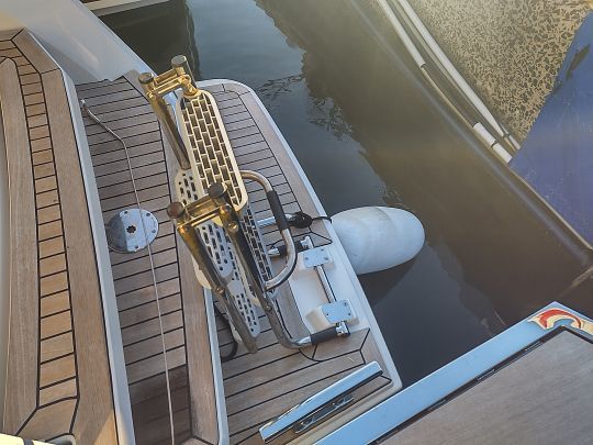 La FP41 también destaca por la posibilidad de optar por una plataforma trasera eléctrica, una solución todavía poco habitual en este segmento. Dotada de proas basculantes, permite bajar el auxiliar por debajo de la superficie del agua, o crear una playa baja para nadar, a unos 30 o 40 centímetros por debajo del nivel del mar.