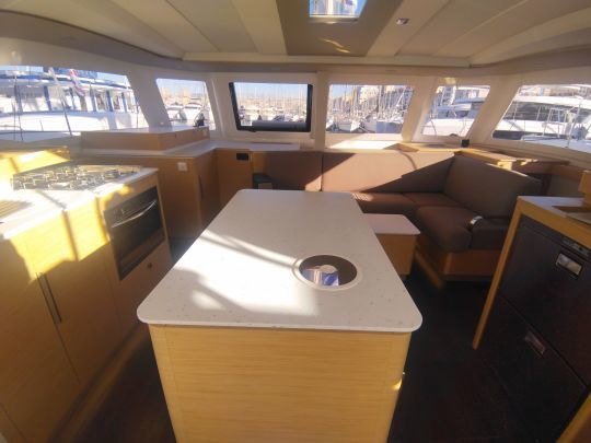 El ventanal de tres hojas difumina en gran medida la frontera entre la bañera y el salón. La cocina está organizada en torno a una isla central, que estructura el espacio y facilita la circulación por el barco. Dispone de una generosa superficie de trabajo y mucho espacio de almacenamiento, y la ventilación natural se ve favorecida por grandes paneles practicables.