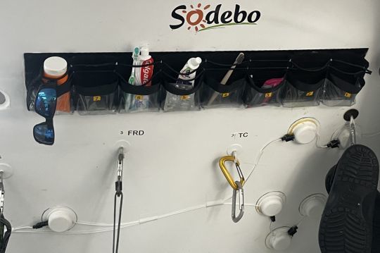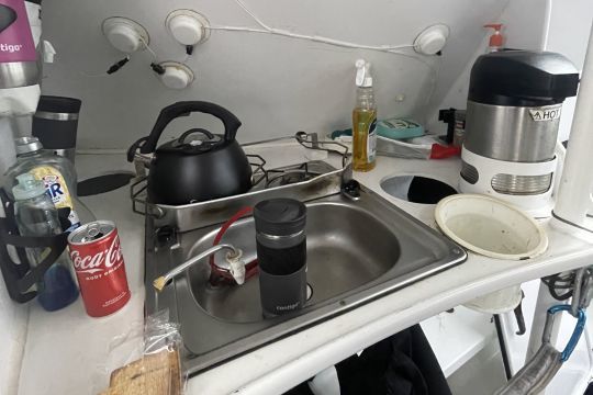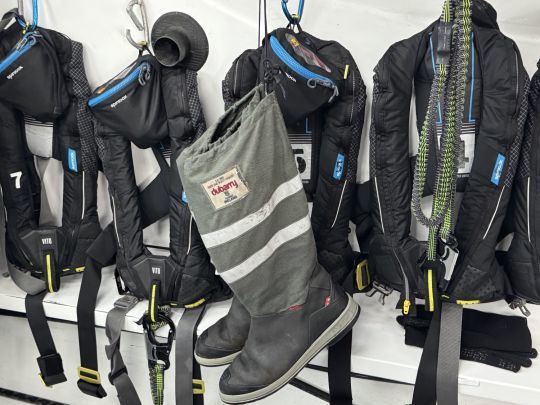 A bordo, el ambiente sigue siendo el de la regata. Los cepillos de dientes de los siete tripulantes están en su sitio. No se ha movido nada, como si la tripulación acabara de abandonar el barco por unas horas. A su manera, el habitáculo refleja la intensidad de la navegación, con volúmenes reducidos, organizados en aras de la eficacia más que de la comodidad.