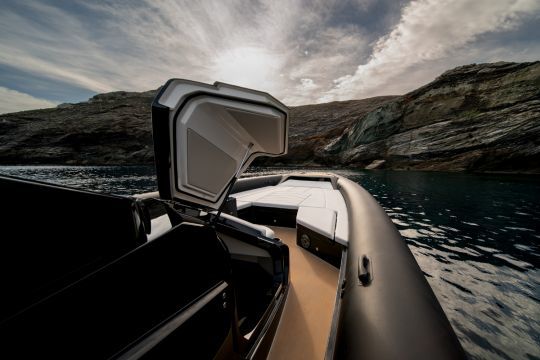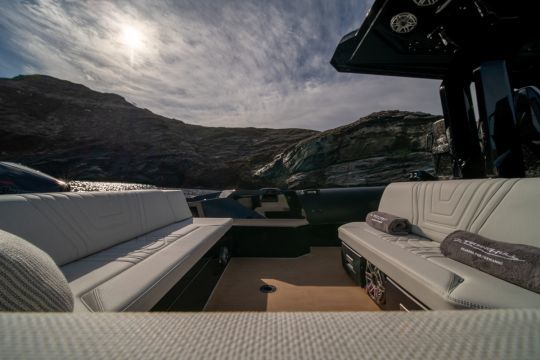 El barco tiene un walkaround completo. Se puede avanzar sin pasar por encima de los asientos. En la proa, un solárium en forma de U ocupa la cubierta de proa, complementado por un banco orientado hacia delante integrado en la consola central.